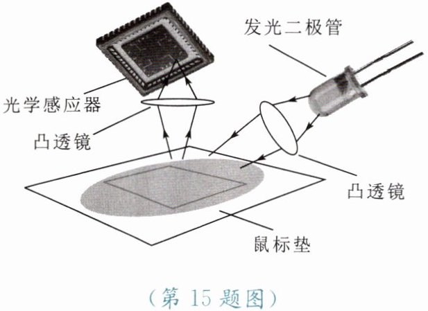 15. 光电鼠标的应用非常广泛。如图所示,它工作时,发光二极管发出的光经凸透镜会聚后照射到鼠标垫并被反射到鼠标内的光学感应器上。当鼠标移动时,光学感应器会连续拍摄鼠标垫表面所成的像,并利用数字信号处理来比较各个影像,以确定移动的距离和方向。产生的结果会传回计算机,屏幕上的光标会根据这些结果进行移动。图中的光学感应器、凸透镜、发光二极管等元件固定在鼠标内。当发光二极管的光照射在粗糙的鼠标垫上时会发生