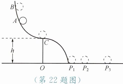 的大小不变。小兵增加 $ h $ 的高度,仍让小球从 $ A $ 点自由滑下,此时小球落在地面上的 $ P_3 $ 点,比较 $ OP_3 $ 和$ OP_1$
