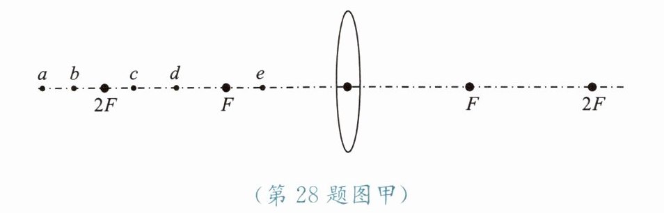 28. 小宇在做“探究凸透镜成像规律”实验,其实验装置的示意图如图所示。a、b、c、d、e是主光轴上的5个点,F点和2F点分别是凸透镜的焦点和二倍焦距点。
