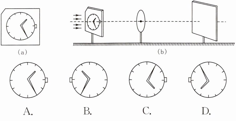 (2) 小宇做完实验后,又想用手表代替蜡烛,看它在光屏上能成什么样的像。于是他在透明的玻璃板上用黑色笔画了个手表盘,如图(a)所示。把这个玻璃板放在蜡烛的位置上,并用平行光源对着玻璃板上的表盘照射,如图(b)所示。移动光屏直到成清晰的像为止。此时表盘在光屏上所成的像是图(c)中的 (
