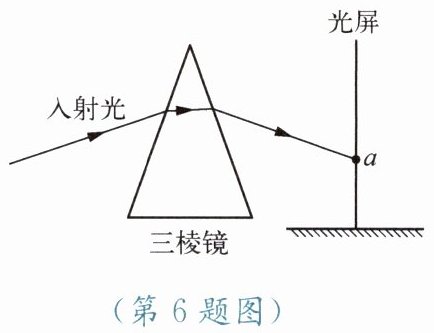 6. 如图所示,一束红光经过三棱镜折射后,在光屏上a点处形成一个红色光斑。现保持入射位置、方向及三棱镜位置不变,仅将红光改为紫光。下列说法中正确的是(