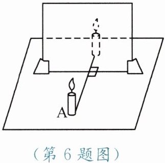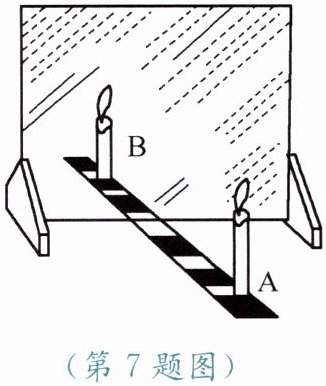 7. 小华在做“探究平面镜成像的特点”实验时,将玻璃板竖直放在水平桌面上,再取两段相同的蜡烛 A 和 B 一前一后竖直放在桌面上,点燃玻璃板前的蜡烛 A,再移动蜡烛 B,直到看上去它与蜡烛 A 所成的像完全重合,如图所示。在此实验中: