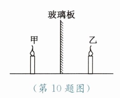 10. 如图所示,某小组用甲、乙两根相同的蜡烛,玻璃板,刻度尺等器材探究平面镜成像的特点。他们在实验中发现,无论怎样移动点燃的甲蜡烛,在玻璃板的另一侧都可以使乙蜡烛与甲蜡烛的像完全重合。他们进一步测量了两根蜡烛到玻璃板的距离,记录的数据如下表所示。