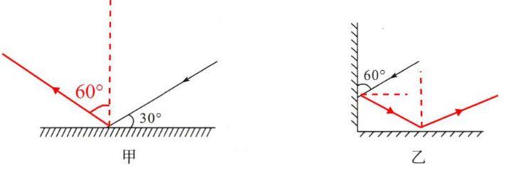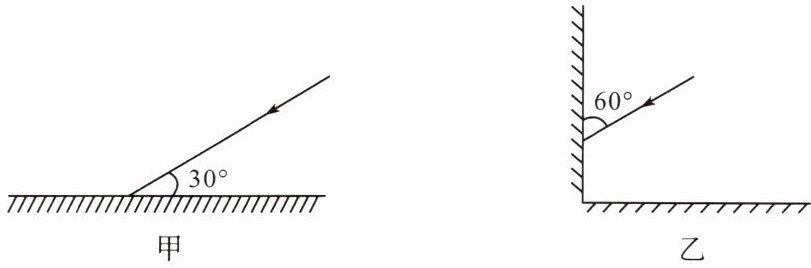 (1)如图甲所示,光与镜面成 $30^{\circ}$ 角射到平面镜上,请在图中画出反射光线,并标出反射角的度数。