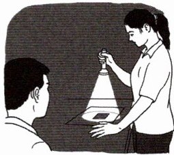 练习:晚上,在桌面上铺一张白纸,把一小块平面镜平放在白纸上,让手电筒的光正对着平面镜照射,如右图所示。从侧面看,感觉白纸比较