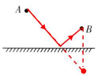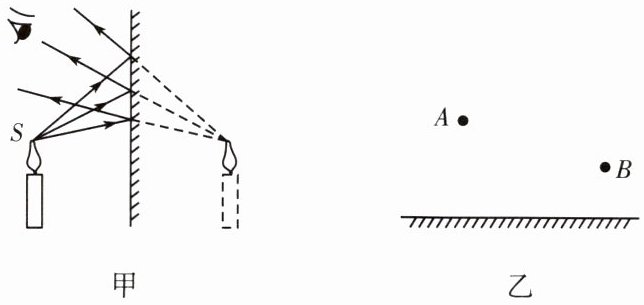 的交点处。练习:如图乙所示,由 $A$ 点发出的一条入射光线,经平面镜反射后通过 $B$ 点,请根据平面镜成像规律,在图中作出此条入射光线及其反射光线。