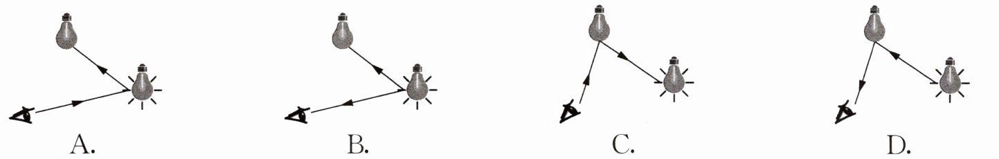 2. 黑暗的房间里有两盏电灯,只有一盏灯点亮,但人能看到未点亮的灯泡。下列对于“看到未点亮灯泡”所画的光路图,正确的是(
