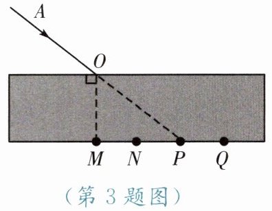 3. 如图所示,一束激光 $ AO $ 从空气斜射入玻璃砖,经折射后再从另一侧射出,其出射点可能是图中的(