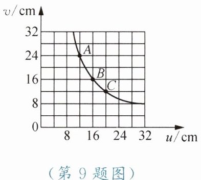 9. 某物理兴趣小组在做“探究凸透镜成像规律”的实验过程中,记录并绘制了像到凸透镜的距离v和物体到凸透镜的距离u的关系图像,如图所示。下列判断中正确的是(