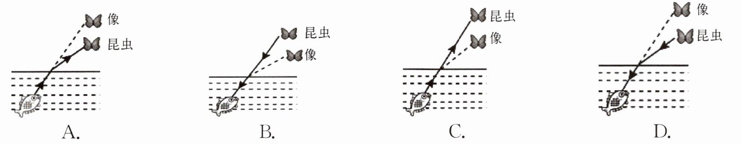 10. 喷水鱼因其特殊的捕食方式而得名,它能喷出一股水柱,准确击落空中的昆虫。下列各图中能正确表示喷水鱼看到的昆虫像的光路图是(