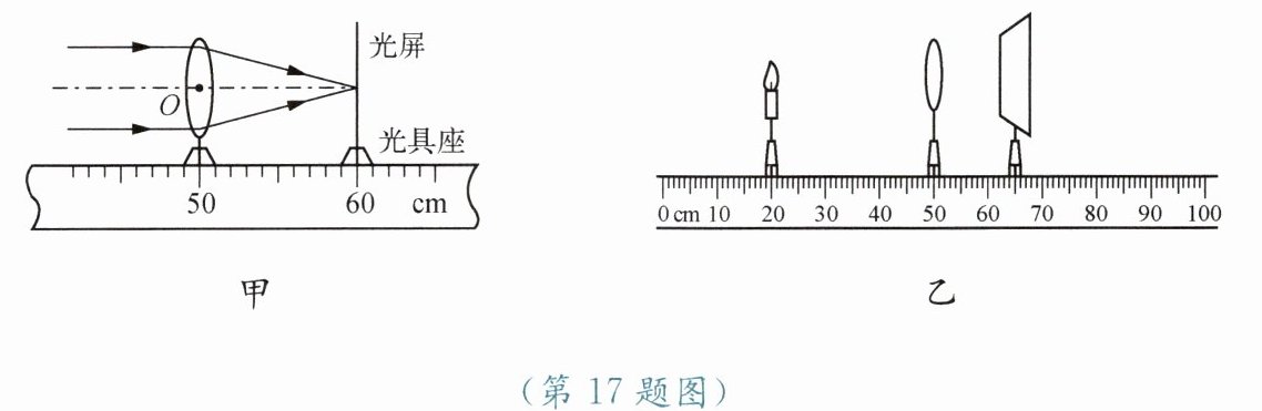17. 在做“探究凸透镜成像的规律”实验中,平行于主光轴的光线经凸透镜后会聚在光屏上的一点,如图所示。