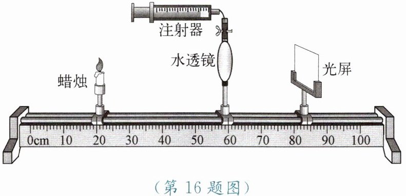 16. 在探究近视眼的矫正课外实验中:调整烛焰(模拟远处的物体)、水凸透镜(模拟晶状体,与注射器相连,其凸起程度可通过注射器注入或抽出水来调节)、光屏(模拟视网膜)在光具座上的位置。