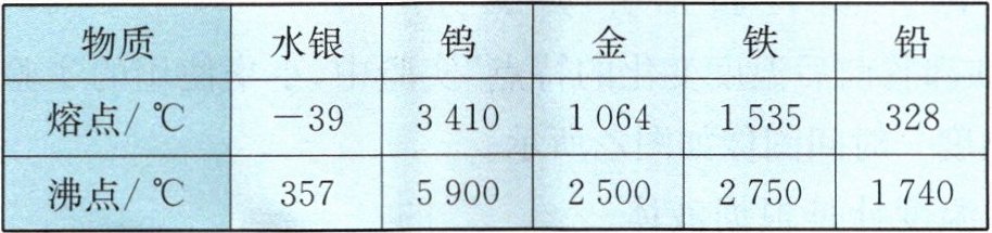 |熔点/℃|-39|3410|1064|1535|328|