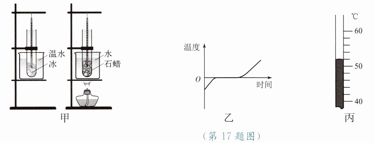 (选填“冰”或“石蜡”)的温度随时间变化的图像。图丙所示温度计显示的是石蜡某时刻的温度,它的示数是52