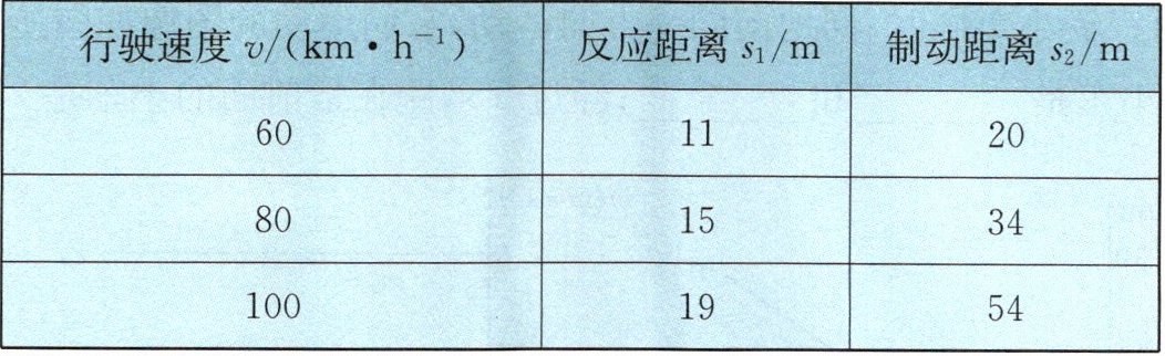 |行驶速度 $ v/(km \cdot h^{-1}) $|反应距离 $ s_1/m $|制动距离 $ s_2/m $|