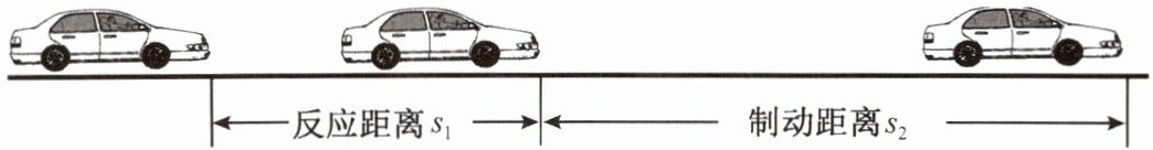 例 4 汽车追尾是高速公路上经常发生的一类交通事故,其重要原因是遇到意外情况时汽车不能立即停下。研究发现,司机从看到危险情况到踩刹车需要一段时间,这段时间叫作反应时间。在反应时间内汽车要保持原来速度前进一段距离,这段距离叫作反应距离;从踩刹车到汽车停止,汽车还要减速前进一段距离,这段距离叫作制动距离,如图所示。