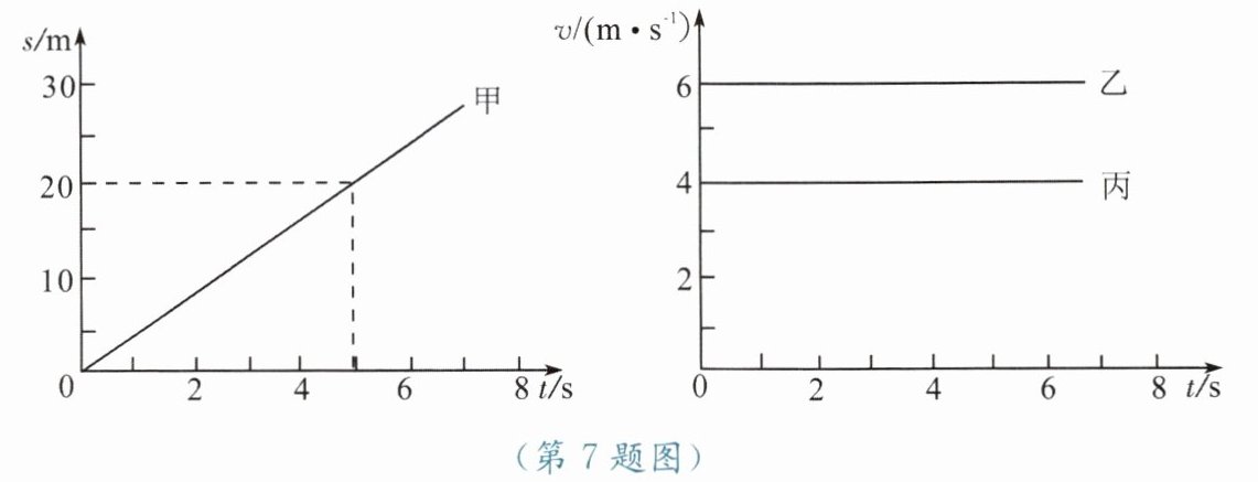 7. 甲、乙、丙三辆小车同时、同地向同一方向运动,它们运动的图像如图所示,由图像可知:运动速度相同的小车是