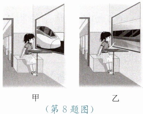 8. 小华坐在列车上,透过车窗观察邻近轨道上的另一辆列车。她先后看到的情景如图甲、乙所示。根据所学的知识可以判断,两列车的运动情况不可能是(