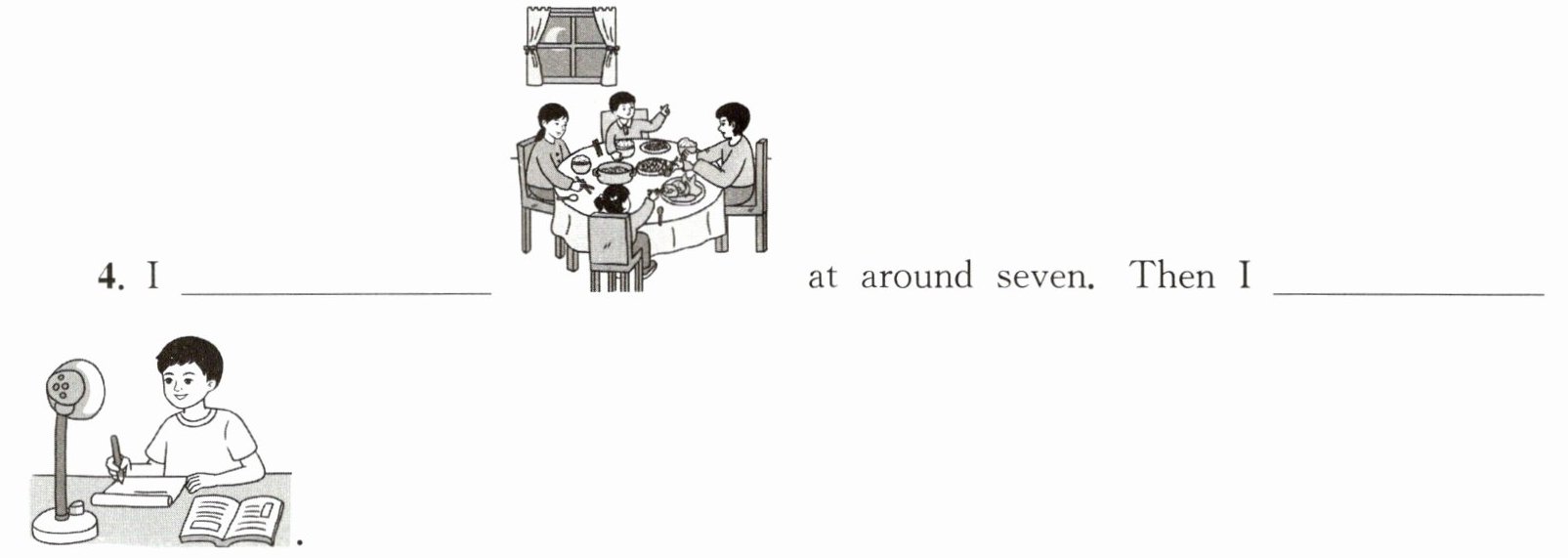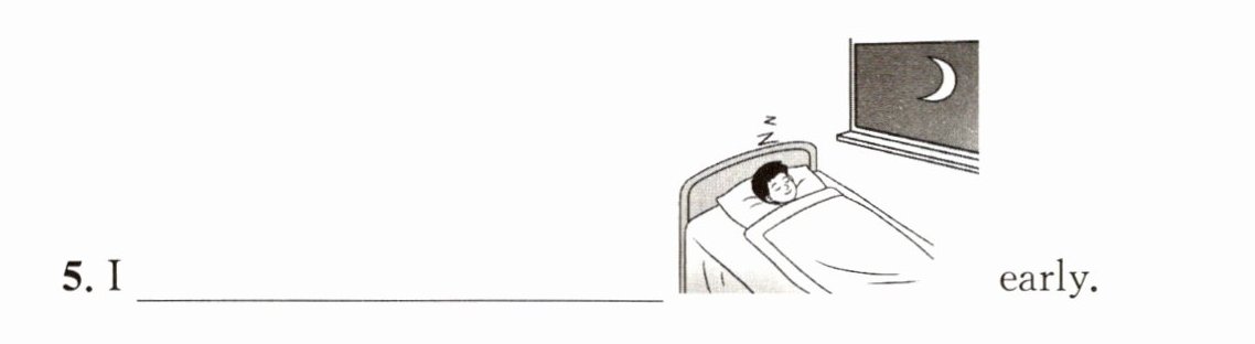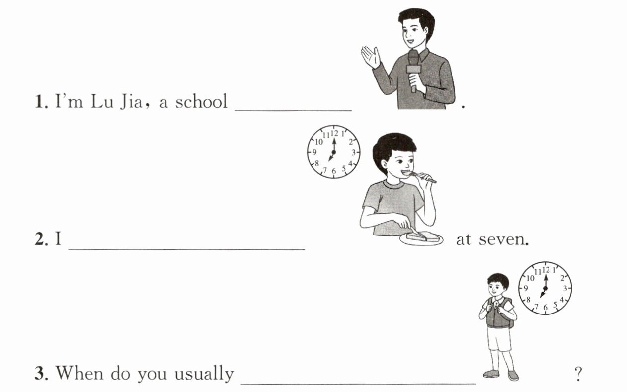1. reporter 2. have breakfast 3. go to school 4. have dinner; do my homework 5. go to bed