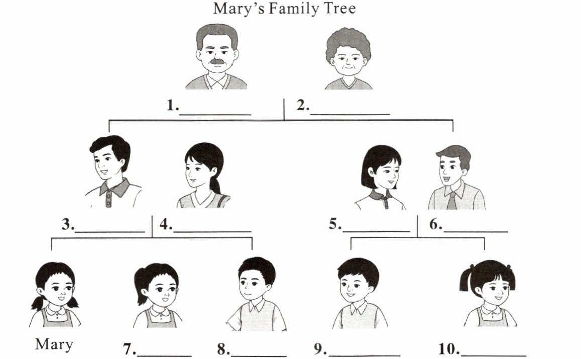 答案:1. grandfather/grandpa 2. grandmother/grandma 3. father/dad 4. mother/mum 5. aunt 6. uncle 7. sister 8. brother 9. cousin 10. cousin
