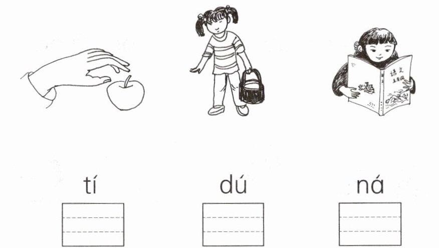 观察插图,第一幅图是手拿起苹果,对应“ná”;第二幅图是女孩提篮子,对应“tí”;第三幅图是女孩读书,对应“dú”。在田字格中规范书写汉字。
