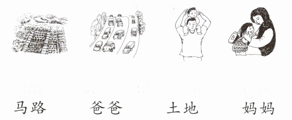 答案:第一幅图连“土地”;第二幅图连“马路”;第三幅图连“爸爸”;第四幅图连“妈妈”。
