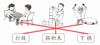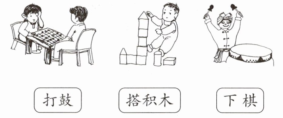 第一幅图两个孩子在桌子旁进行棋盘类游戏,对应“下棋”;第二幅图孩子用积木搭建造型,对应“搭积木”;第三幅图人物手持鼓槌敲击鼓面,对应“打鼓”。