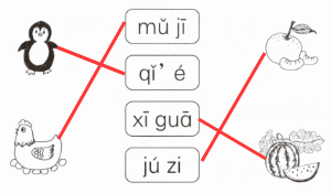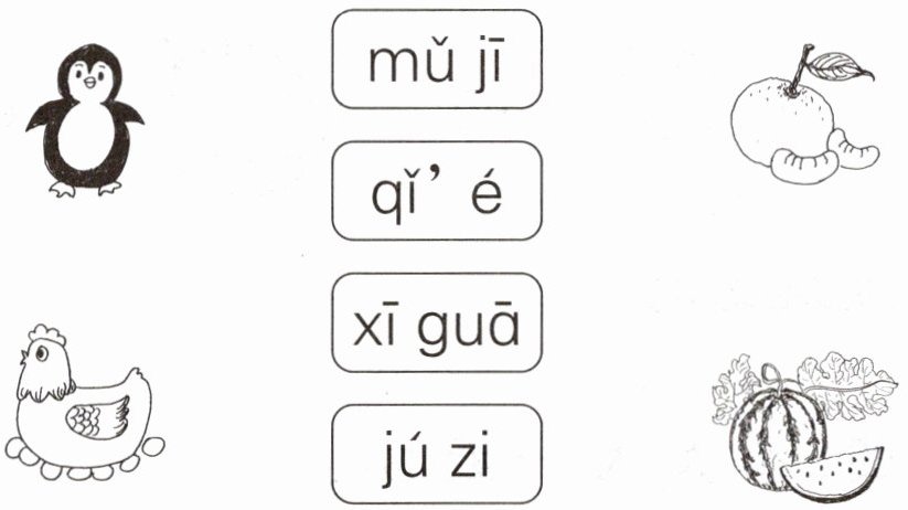 先认读中间的音节“mǔ jī、qǐ’é、xī guā、jú zi”,再观察左右两边的图片。左边第一张图是企鹅,对应“qǐ’é”;左边第二张图是母鸡,对应“mǔ jī”。右边第一张图是橘子,对应“jú zi”;右边第二张图是西瓜,对应“xī guā”。然后将图片与对应的音节相连。