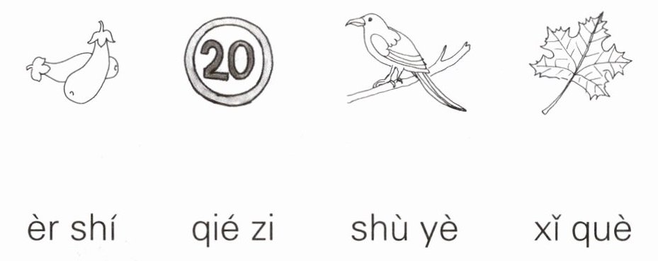 先认读图片内容,第一幅是茄子(qié zi),第二幅是20(èr shí),第三幅是喜鹊(xǐ què),第四幅是树叶(shù yè),然后将图片与对应的拼音连线。