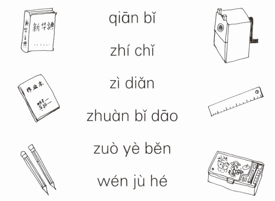 根据拼音认读词语,结合插图中物品的特征进行连线。"qiān bǐ"对应铅笔插图,"zhí chǐ"对应直尺插图,"zì diǎn"对应新华字典插图,"zhuàn bǐ dāo"对应转笔刀插图,"zuò yè běn"对应作业本插图,"wén jù hé"对应文具盒插图。