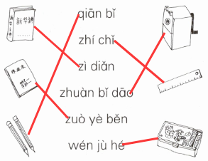 三、你认识这些书本文具吗?读一读,连一连。