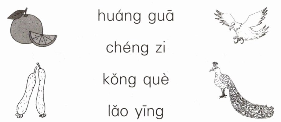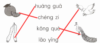 先认读拼音,huáng guā(黄瓜)对应下方两根长条蔬菜图;chéng zi(橙子)对应上方带叶子和切片的水果图;kǒng què(孔雀)对应右下角有长尾巴的鸟图;lǎo yīng(老鹰)对应右上角展翅的鸟图。