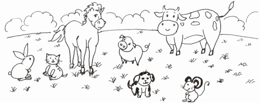 观察插图,识别图中动物对应的名称拼音,在对应的“〇”中打“√”。图中动物有小猫、马儿、兔子、小猪、老鼠、奶牛、花狗。