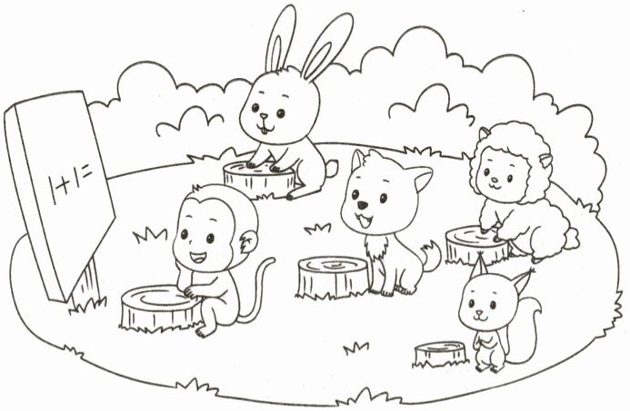 )边的太阳升起了,小动物们开始上课了。小狗坐在正中间,小猴在小狗的(③