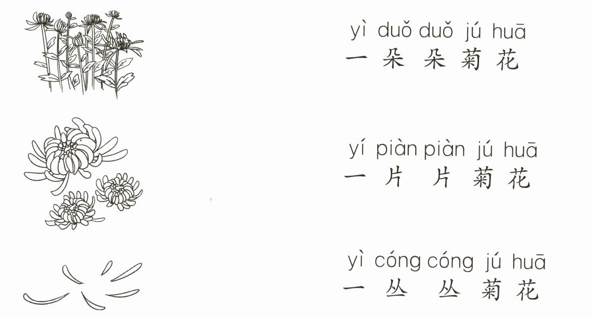 (第一幅图连“一丛丛菊花”,第二幅图连“一朵朵菊花”,第三幅图连“一片片菊花”)