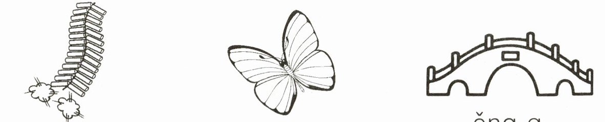 根据插图内容,结合一年级上册拼音知识补充音节。第一图为鞭炮(biān pào),填iān、ào;第二图为蝴蝶(hú dié),填ú、ié;第三图为拱桥(gǒng qiáo),填g、iáo;第四图为气球(qì qiú),填q、iú;第五图为蜗牛(wō niú),填w、n;第六图为图书(tú shū),填t、sh。