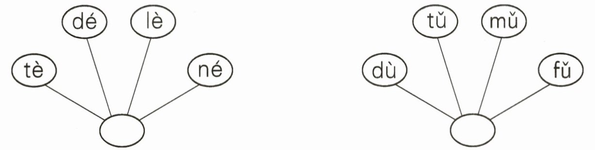 2. 对于第一组音节“dé、lè、tè、né”,韵母都是“e”;对于第二组音节“tǔ、mǔ、dù、fǔ”,韵母都是“u”。