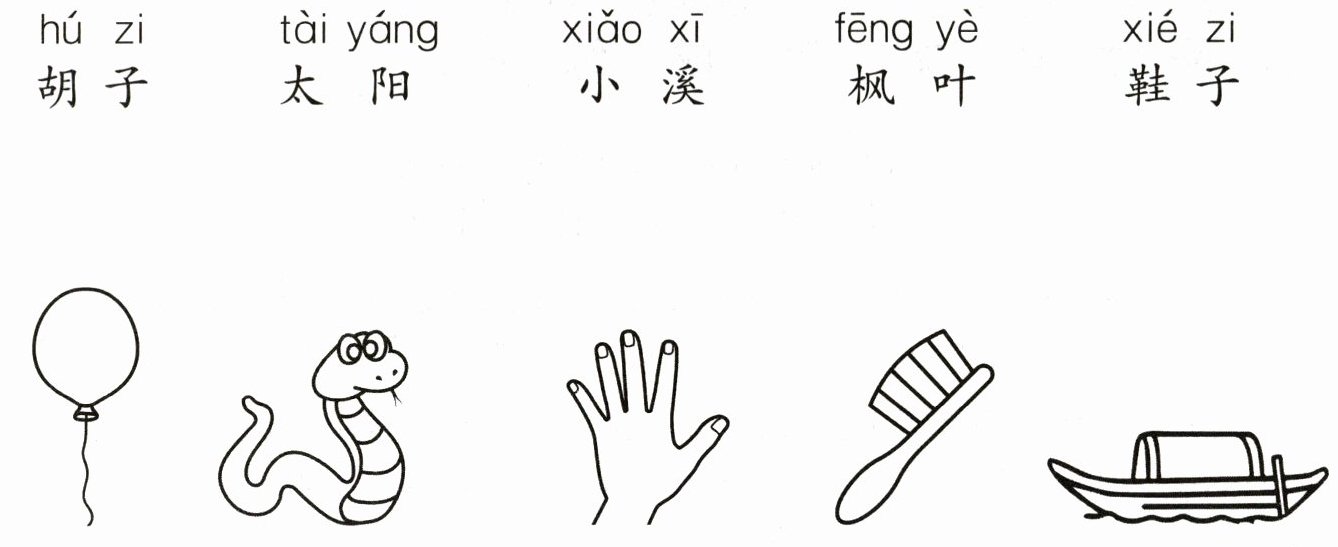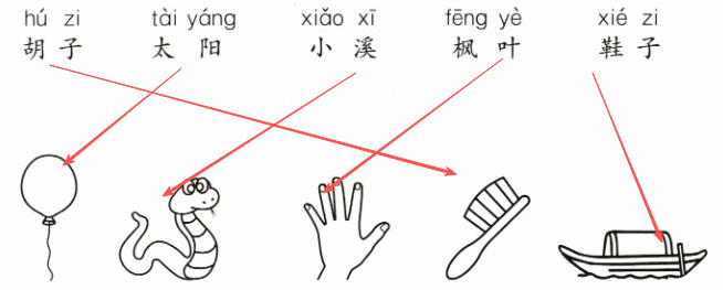 胡子-针;太阳-火球;小溪-带子;枫叶-手掌;鞋子-小船;月亮 圆盘