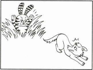 大灰狼听到声音,又看到草丛里像老虎一样的身影,以为真老虎来了,吓得转身就跑,一下子就消失得无影无踪。