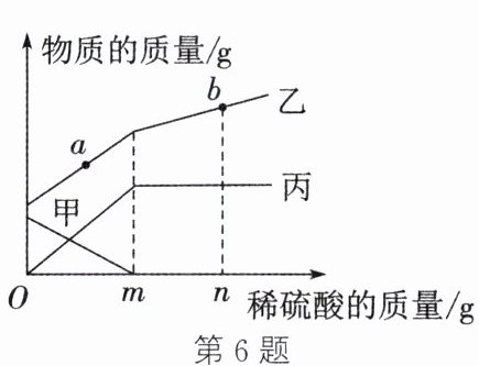 答案:6.C 解析:甲、乙两物质的起点不为0,氢氧化钠溶液中含有氢氧化钠和水两种物质,甲物质质量逐渐减小为0,则甲物质为氢氧化钠。反应生成硫酸钠和水,丙物质的起点为0,则丙为硫酸钠的质量,A正确。加入m g稀硫酸时,硫酸钠质量达到最大值,之后再加入稀硫酸,硫酸钠的质量也不再增加,说明氢氧化钠和硫酸恰好完全反应,B正确。a点对应的溶液中氢氧化钠有剩余,溶液中溶质为硫酸钠和氢氧化钠,C错误。b点时稀硫酸已过量,溶液显酸性,能使紫色石蕊试液变红,D正确。