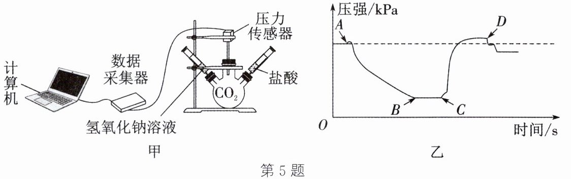 答案:5.D 解析:向瓶中推入NaOH溶液,氢氧化钠与二氧化碳反应生成碳酸钠和水,导致容器中压强减小,A正确;最终压强比初始压强小,可能是因为有部分二氧化碳溶于水,B正确;BC段气压不变,是因为$CO_2$与NaOH溶液反应基本停止,对压强没有影响,C正确;碳酸钠和盐酸反应生成的二氧化碳少于或等于初始的二氧化碳的量,D点压强比瓶内初始压强大,是因为加入的氢氧化钠溶液、盐酸占据了一定体积,气体被压缩,D不正确。