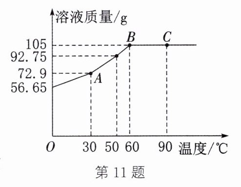 溶液。(3)将$55\ g\ KNO_3$固体加入$50\ g$水中,充分溶解,测得溶液的质量随温度的变化曲线如图所示。