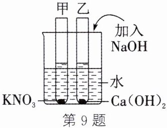 9. (教材 P40 练习与应用 T3 变式)如图所示,甲、乙试管中分别盛有硝酸钾、氢氧化钙的饱和溶液,试管底部均有未溶解的固体。向烧杯中加入一定质量的氢氧化钠固体后,下列分析正确的是 (