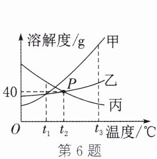 答案:6. (1)$t_2^{\circ}C$时,乙、丙两种物质的溶解度相等,均为40 g (2) 蒸发结晶 (3) 70 (4) AC 解析:(3)$t_2^{\circ}C$时,丙的溶解度为40 g,则该温度下,50 g水中最多可溶解丙的质量为$50\ g×\frac{40\ g}{100\ g}=20\ g$,将25 g丙加入50 g水中,形成溶液的质量为20 g+50 g=70 g。(4) 由图可知,$t_1^{\circ}C$时,溶解度:丙>乙=甲,A正确;降温过程中,溶剂质量不变,$t_3^{\circ}C$时,溶解度:甲>乙>丙,等质量的三种物质的饱和溶液中,溶剂质量:丙>乙>甲,B错误;由$t_3^{\circ}C$降温至$t_1^{\circ}C$,甲、乙溶解度减小,$t_1^{\circ}C$时,甲、乙的溶解度相等,且甲中溶剂质量小于乙,则析出晶体的质量:甲>乙,丙溶解度增大,降低温度溶液质量不变,则所得溶液质量:丙>乙>甲,C正确;降温后,得到$t_1^{\circ}C$时甲和乙的饱和溶液、丙的不饱和溶液,$t_1^{\circ}C$时溶解度:甲=乙,则溶质质量分数:甲=乙,丙溶液的溶质质量分数与$t_3^{\circ}C$时丙的饱和溶液相同,$t_3^{\circ}C$时丙的溶解度<$t_1^{\circ}C$时甲和乙的溶解度,则溶质质量分数:丙<乙=甲,D错误。
