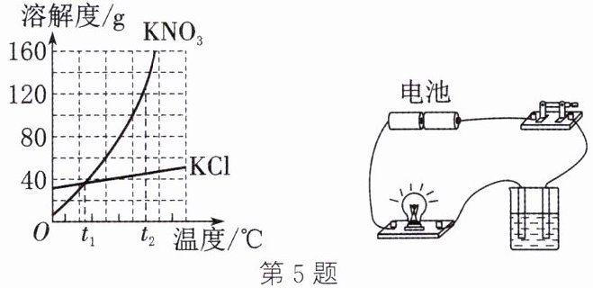 答案:5. D 解析:比较不同物质的溶解度需要指明温度,题中没有确定温度,不能说明$KNO_3$的溶解度大于KCl的溶解度,A错误;$t_1^{\circ}C$时,$KNO_3$和KCl溶解度相等,根据一定温度下饱和溶液的溶质质量分数=$\frac{S}{100\ g+S}×100\%$可知,$t_1^{\circ}C$时,饱和$KNO_3$溶液和饱和KCl溶液的溶质质量分数相等,但没有确定溶液是否饱和,故不能说明$t_1^{\circ}C$时$KNO_3$溶液和KCl溶液的溶质质量分数相等,B错误;$t_2^{\circ}C$时,向饱和KCl溶液中加入较稀的KCl溶液,溶液的溶质质量分数变小,单位体积内的离子个数变少,导电性变弱,则灯泡亮度变弱,C错误;将$t_2^{\circ}C$的两种物质的饱和溶液降温到$t_1^{\circ}C$,两种物质的溶解度都减小,都有晶体析出,溶液的溶质质量分数变小,溶液仍为饱和溶液,一定温度下饱和溶液的溶质质量分数为$\frac{S}{100\ g+S}×100\%$,溶解度越大,溶质质量分数越大,$t_1^{\circ}C$时,$KNO_3$和KCl溶解度相等,所得溶液的溶质质量分数相等,D正确。