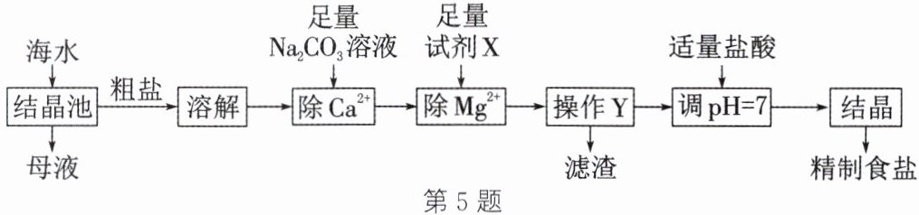 5. 海水中蕴藏着丰富的化学资源。工业上常利用海水提取粗盐(含 $\mathrm{CaCl_2}$、$\mathrm{MgCl_2}$ 等杂质),然后进一步得到精制食盐,并广泛用于氯碱工业和侯氏制碱工业等。提取过程如图所示: