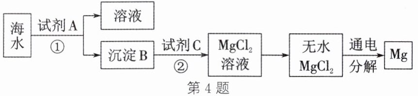 。答案:4.(1)金属 (2)$\mathrm{MgCl_2 + Ca(OH)_2 \xlongequal{ } Mg(OH)_2 \downarrow + CaCl_2}$ (3)$\mathrm{Mg(OH)_2 + 2HCl \xlongequal{ } MgCl_2 + 2H_2O}$ (4)将氯化镁富集起来得到比较纯净的氯化镁