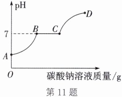 11. (2025·济宁模拟)小明同学对氢氧化钙和盐酸中和反应后的溶液成分进行探究,他向一定质量的反应后溶液中滴加溶质质量分数为 $10\%$ 的 $ Na_2 CO_3$ 溶液。实验过程中加入 $ Na_2 CO_3$ 溶液的质量与溶液 $ pH$ 关系如图所示,下列说法错误的是 (