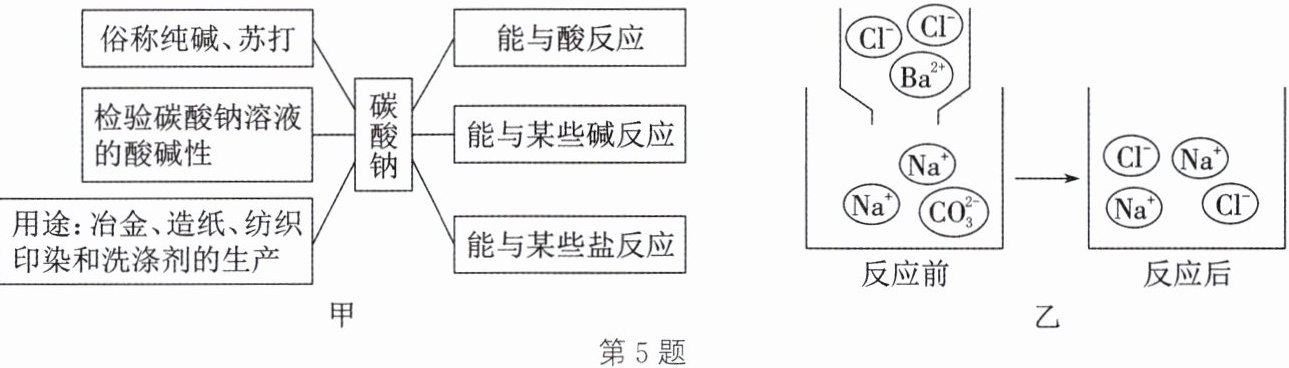 5. (科学思维)以典型物质为核心,进行问题的设置与整合,是我们全面认识物质性质及应用的有效途径。小明同学对碳酸钠进行了如图甲梳理。请联系所学知识,回答下列问题:
