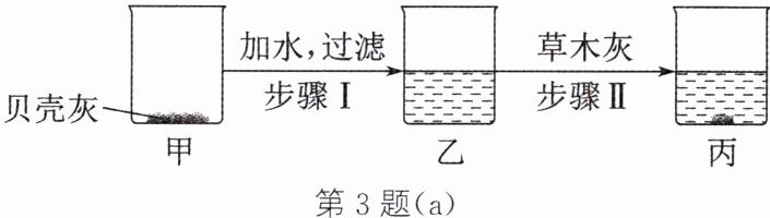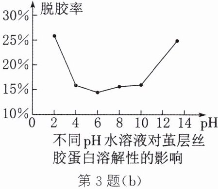 。答案:3.(1) ① 使氧化钙转化为氢氧化钙 ② K₂CO₃ + Ca(OH)₂ = CaCO₃↓ + 2KOH ③ KOH、K₂CO₃ 或 Ca(OH)₂、KOH 或 KOH (2) 没有气泡冒出 (3) 加入的稀盐酸较少,可能只与 KOH 反应,未与 K₂CO₃ 反应 (4) B (5) pH=13.2 时的脱胶率大于 pH=11.6 时的脱胶率 解析:(1) ② 贝壳灰加水发生反应转化为氢氧化钙,草木灰的主要成分是碳酸钾,氢氧化钙与碳酸钾反应生成碳酸钙和氢氧化钾。③ 碳酸钾过量时,溶质为 KOH、K₂CO₃;氢氧化钙过量时,溶质为 Ca(OH)₂、KOH;恰好完全反应时,溶质只有 KOH。(2) 实验结论是溶液中没有 K₂CO₃,所以取少量溶液于试管中,滴入几滴稀盐酸,没有气泡冒出。